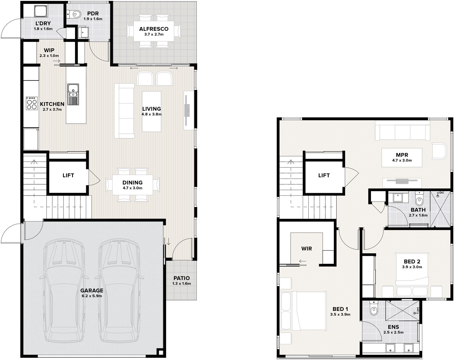 The Amara is a spacious two-bedroom, double-storey home combining